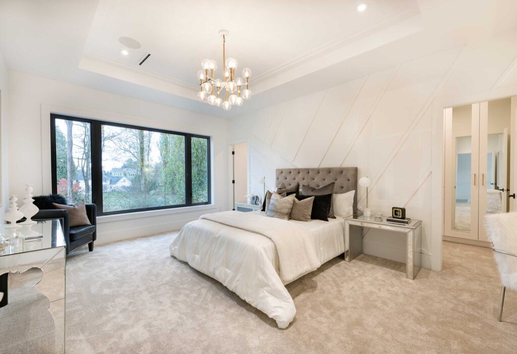 Upstairs, a large picture window frames treetop views, filling the bedroom with soft light and a sense of retreat. A layered lighting scheme and neutral palette enhance the serene atmosphere, while mirrored furniture and a feature wall bring a touch of elegance.